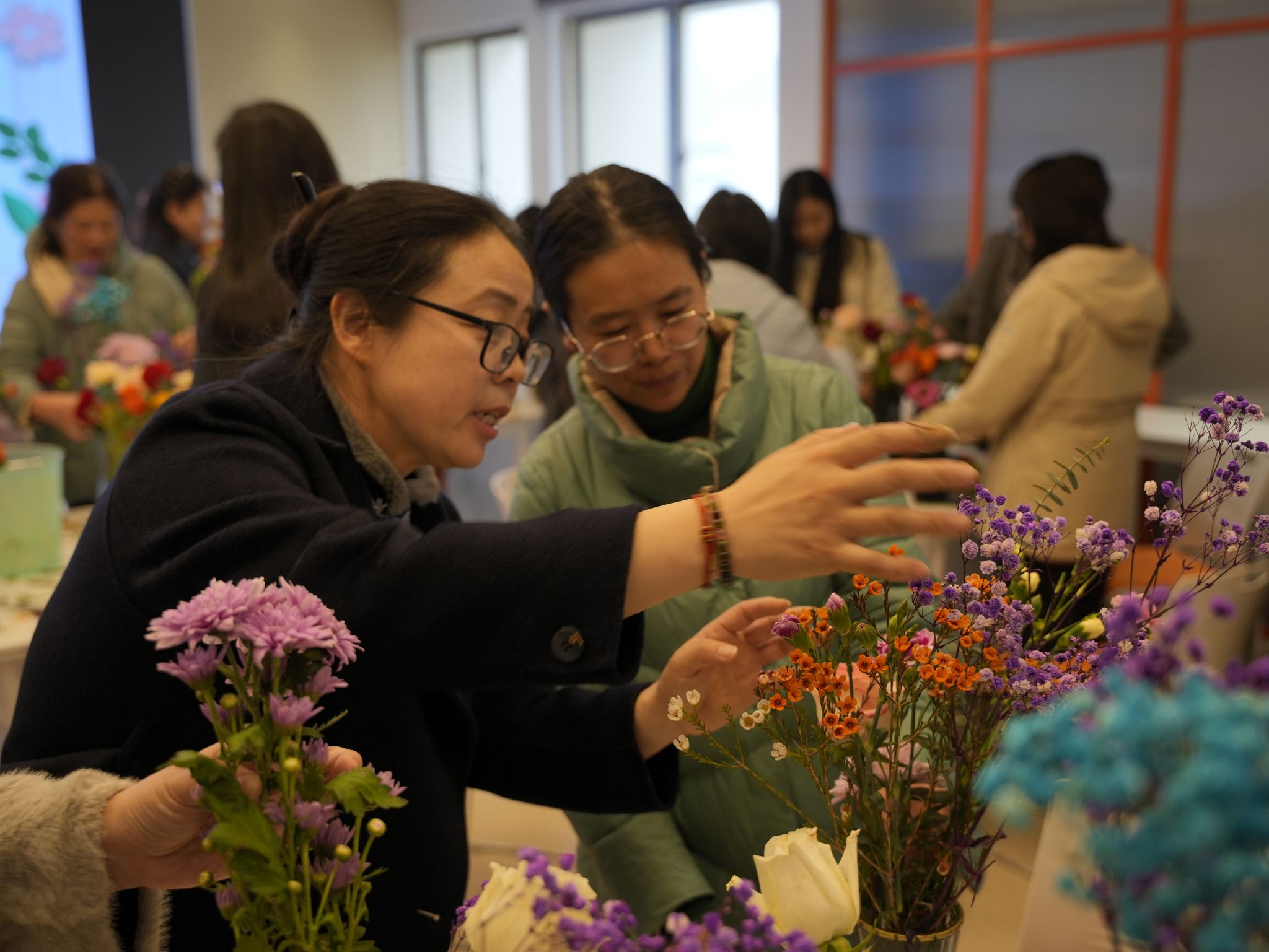 活动现场花香弥漫,气氛温馨。学院党委书记杨如丽为大家讲解花艺知识,从花材品种、色彩搭配到插花技巧,杨书记细致讲解,女教职工们跃跃欲试。在杨书记的指导下,大家充分发挥想象力和创造力,精心挑选花材,用心搭配色彩,认真修剪枝叶,经过一番努力,一束束错落有致、色彩斑斓的花艺作品呈现在眼前,每一束花都凝结着女教师们对艺术的倾心和对生活的热爱。活动现场欢声笑语不断,大家互相交流插花心得,欣赏彼此的作品,并用手机记录下这美好的瞬间。看着自己亲手创作的插花作品,大家的脸上都洋溢着幸福的笑容,成就感十足。