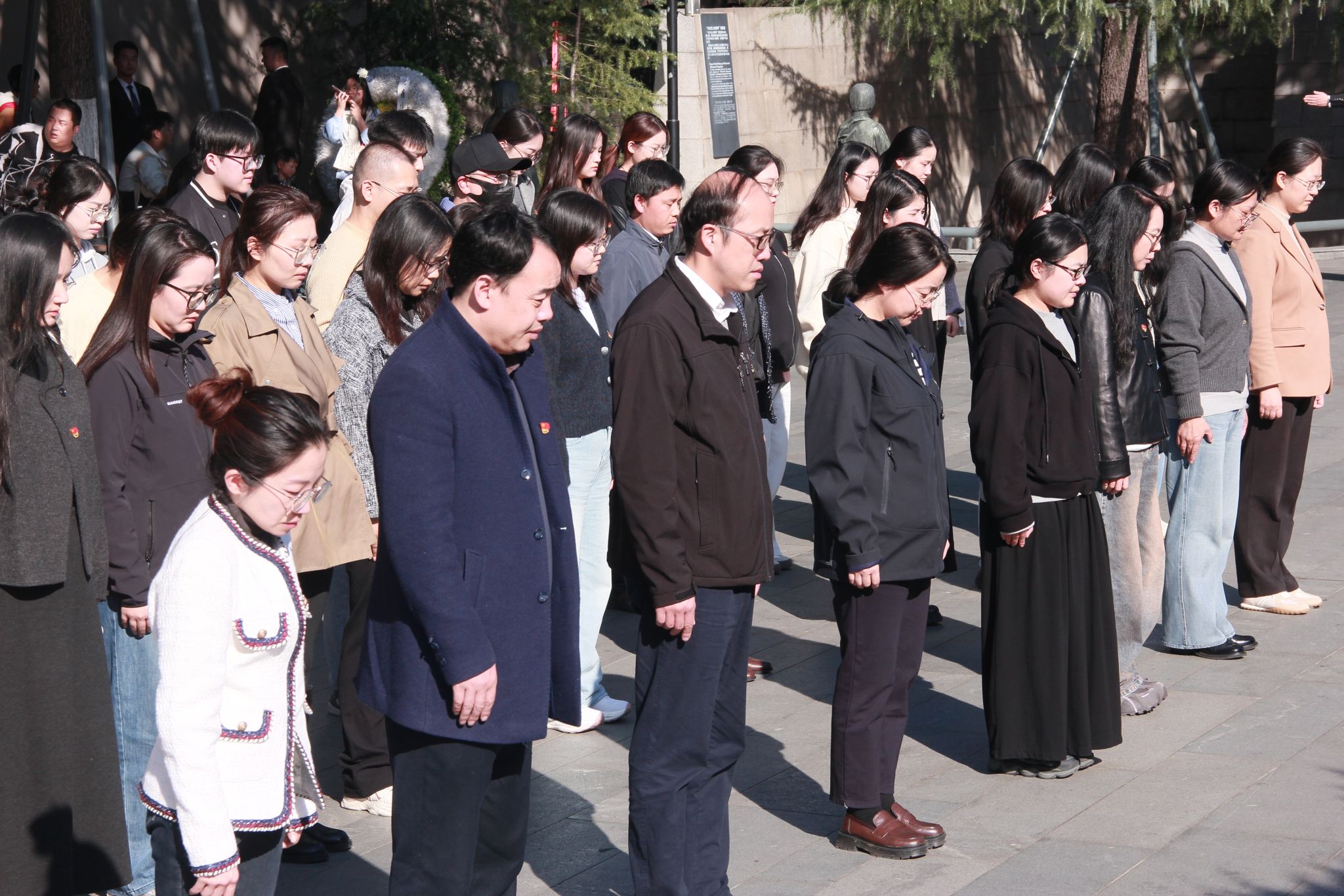 下午2时,全体党员佩戴党徽,怀着沉重肃穆的心情走进纪念馆。在悼念广场前整齐列队,学院党委书记杨如丽整理缎带,带领师生党员向“哭墙”遇难者姓名墙敬献花圈,师生党员在300000余遇难者姓名构成的黑色花岗岩墙面前,向遇难同胞默哀一分钟。