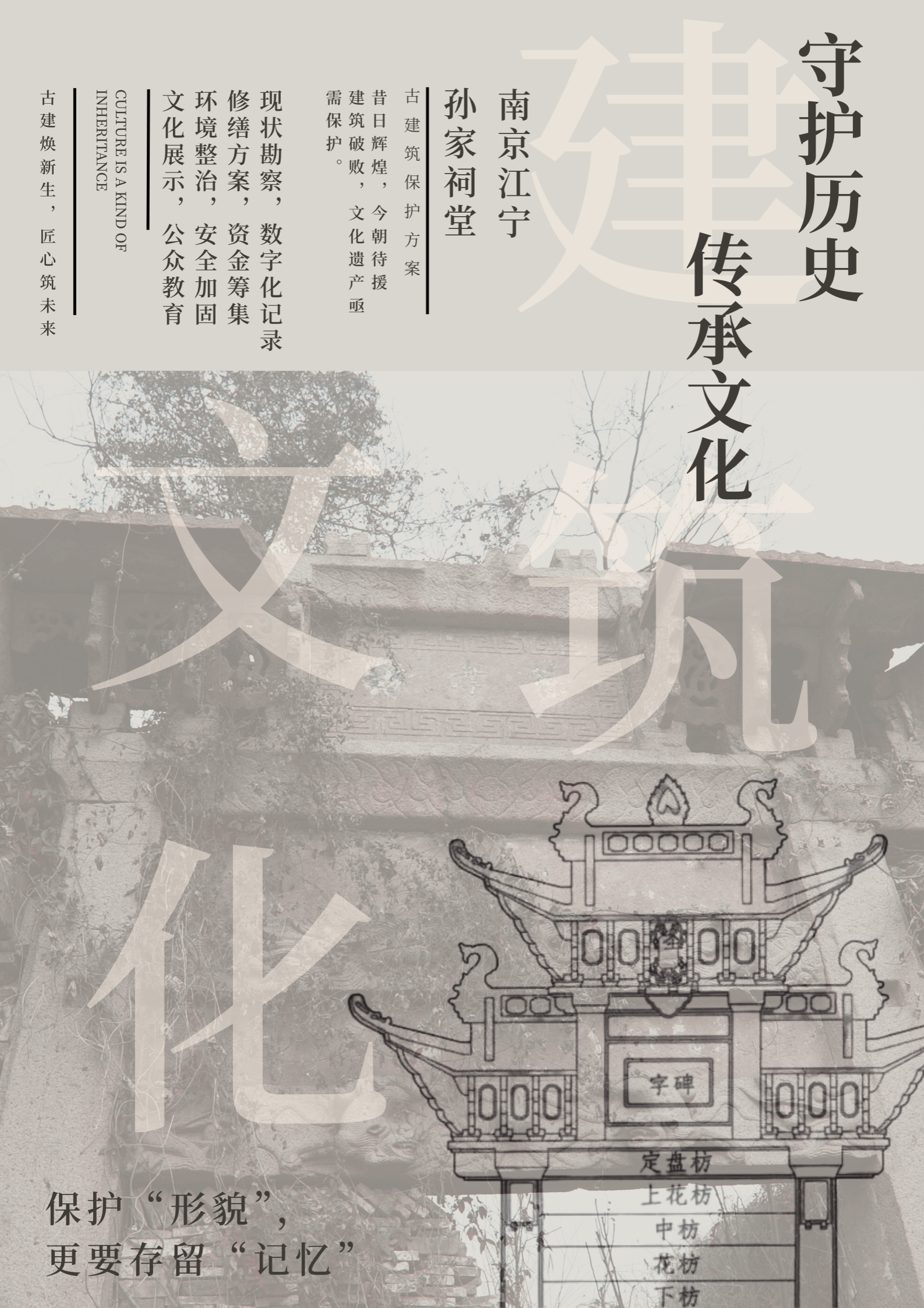 孙家祠堂,位于江苏省南京市江宁区龙眠大道东约200米处。实践初期,团队成员们通过查找资料了解到,孙家祠堂原是江宁县下王墅村的家族宗祠,始建于明末清初,占地面积约1200平方米,距今已有400多年的历史,作为几乎是南京地区现存规模最大的祠堂建筑,它也曾有精致的建筑装饰,见证过无数百姓的世代变迁。破损问题、风雨侵蚀、自然老化以及人为因素的破坏,祠堂的倒塌速度在近年来急剧加快。