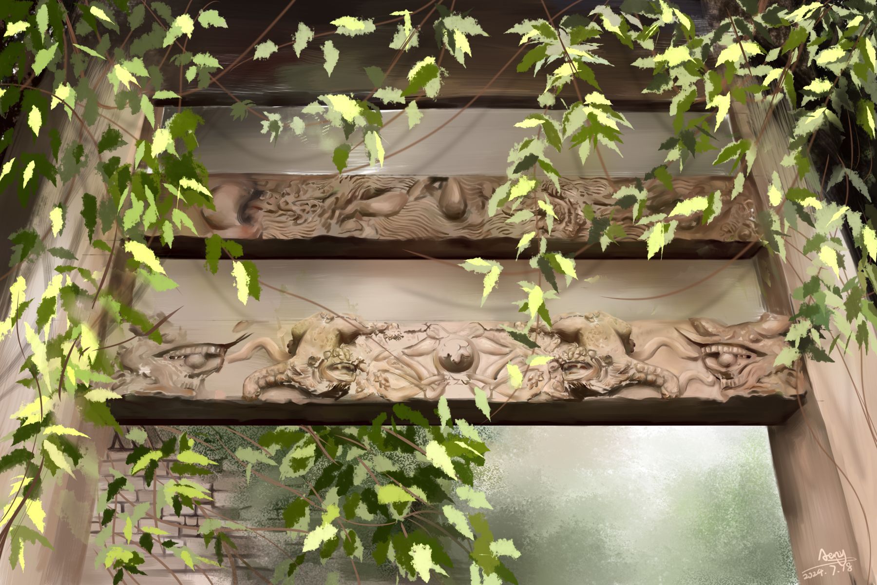 除此之外,团队成员们充分利用丰富的资料,运用专业的技艺,对古建筑之美进行创新创作,对宗祠进行了全方位的艺术再现。速写笔尖流转,勾勒出建筑轮廓的刚劲与柔美;水彩颜料在纸上绽放,渲染出宗祠历史的厚重与色彩;板绘线条细腻入微,捕捉了雕刻艺术的精致与繁复,展现出对传统工艺的敬畏与传承。这些艺术创作不仅赋予了宗祠新的生命,也为后续的保护与修复工作提供了宝贵的视觉资料。