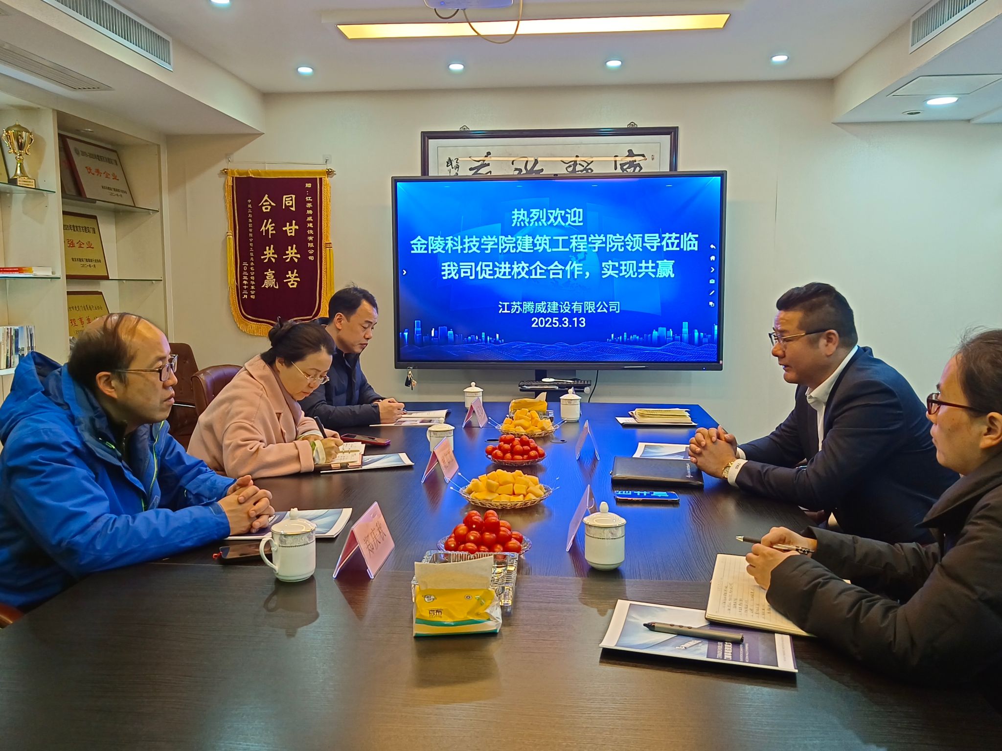 江苏腾威建设有限公司党支部书记、总经理茆金林、技术部经理张秀才、办公室主任吴晓华等热情接待了学院领导一行,并陪同参观了公司展厅、办公环境等,详细介绍了公司发展历程、企业文化、业务范围、人才需求等情况。