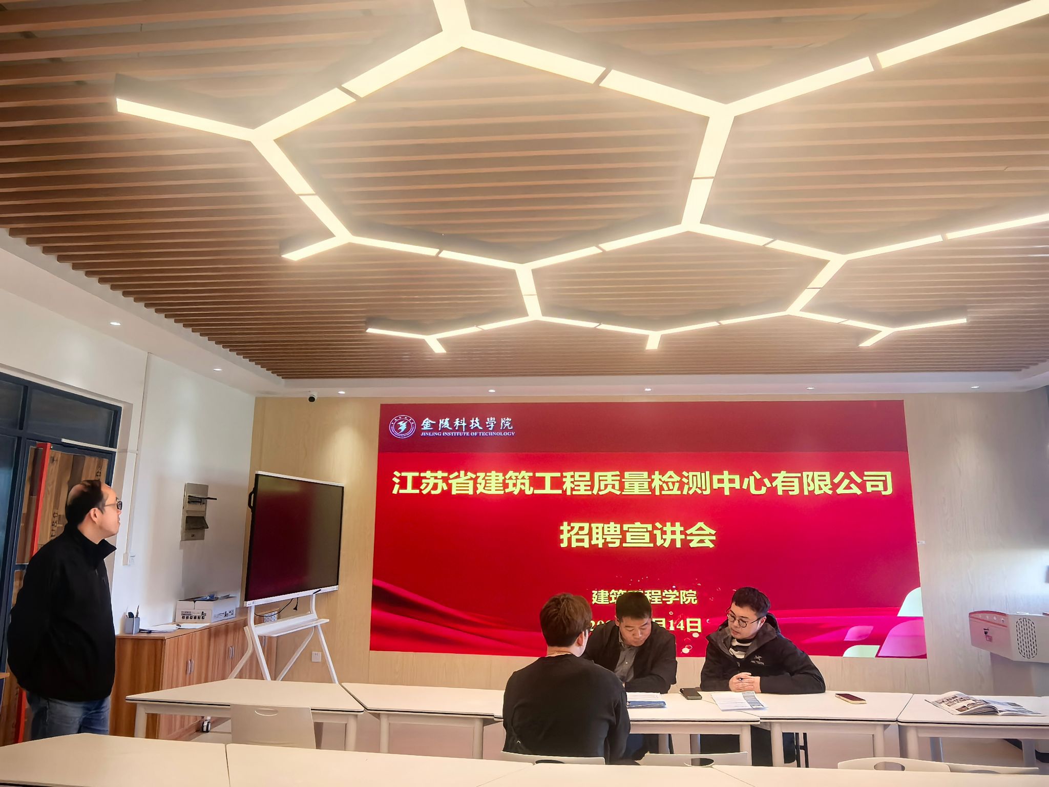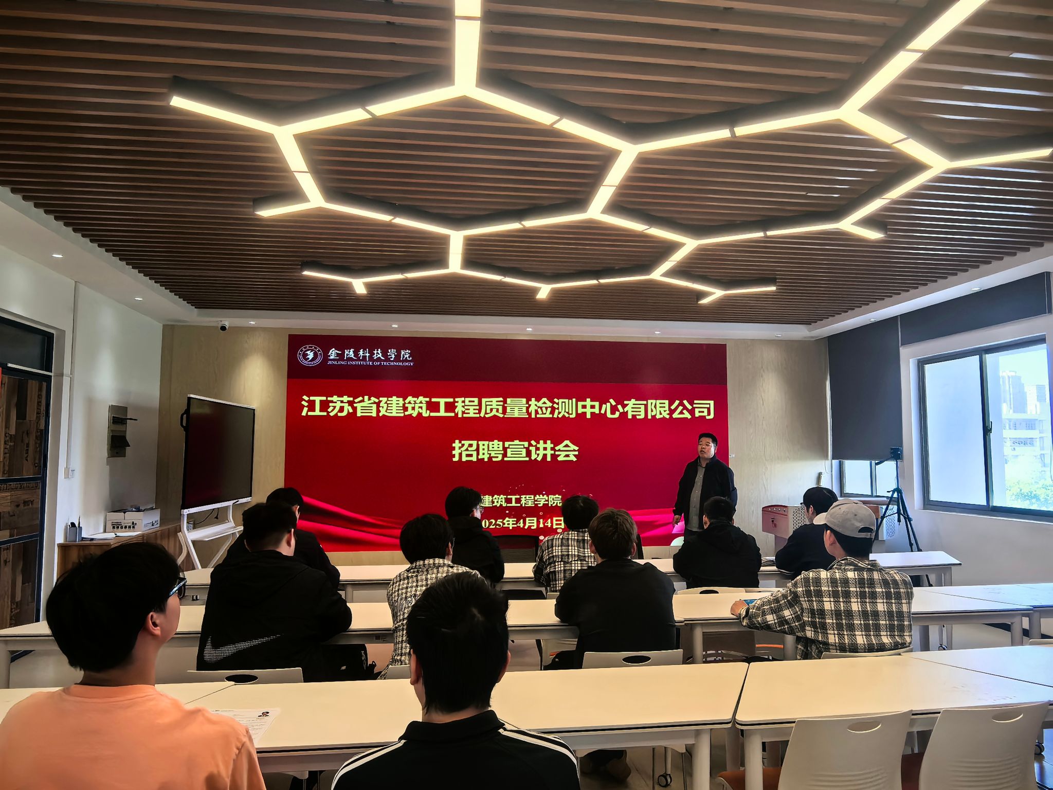 为深化校企合作,搭建优质就业平台,助力学生职业发展,2025年4月14日下午,太阳集团网站8722在工科楼b409举办江苏省建筑工程质量检测中心有限公司专场招聘宣讲会。学院党委副书记郑庆秋、学工办主任鲍飞豹及部分2025届毕业生参会。