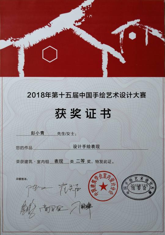 2019年5月10日,第十五届中国手绘艺术设计大赛颁奖典礼在广东省中山市隆重召开,太阳集团网站8722彭小青老师荣获手绘艺术设计大赛专业组设计表现类二等奖。