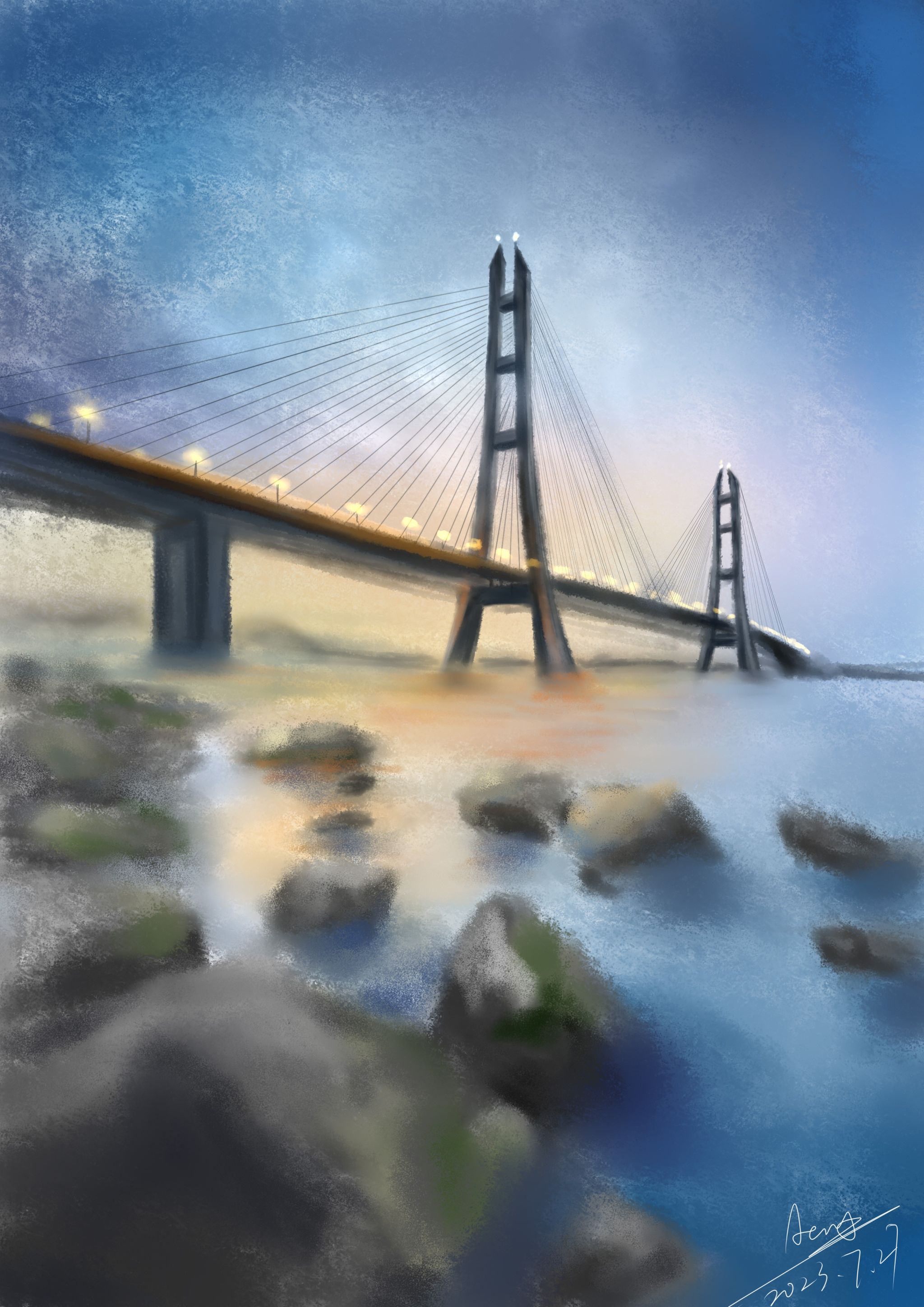 2022级城乡规划专业学生府昱琳则是选择通过机绘作品栩栩如生地再现了南京长江三桥,别称南京大胜关长江大桥。这座标志性桥梁作为我国第一个钢塔设计的桥梁,同时也是世界上首座弧线形塔斜拉桥,承载着丰富的历史和科技成就。作品以其独特的造型为创作焦点,尤其在夜幕降临时,桥梁在灯光的映衬下愈发美丽动人。府昱琳认为作品传达的敬畏之情和对工匠精神的推崇,或许能够激发着观者共鸣。它提醒我们珍视科技创新,尊重工程建设,以及要有勇于为社会进步贡献力量的良好价值观。