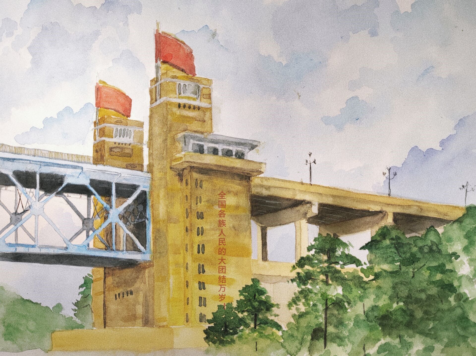 2022级建筑学专业学生潘子晔以南京长江大桥桥头堡照片为灵感,通过水彩作品重现了充满浓厚的历史情感与强烈的团结氛围,其色彩运用充满活力,柔和的色调交相辉映,使桥头堡的厚重感与标语的震撼力相得益彰。潘子晔表示,“画面充满了生机和温情,希望观者能感受到后辈对于历史与文化的敬仰,以及对于团结和和谐的美好向往。”