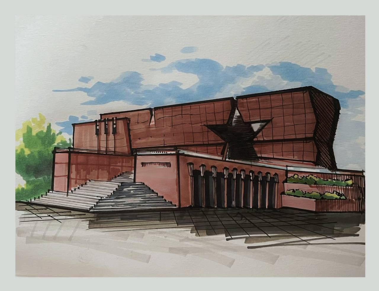 学院组建了以建筑学专业同学为主力的“追忆伟大工程,共践学史力行”暑期社会实践团,团内成员寻找自己感兴趣的或是熟悉的红色印迹,通过绘画专业技能,使红色记忆跃然纸上。在南京这座充满着红色历史与英雄记忆的城市,2021级建筑学专业学生薛乔云用马克笔向我们展现了南京党史馆的壮丽面貌。漫画风格的表现手法,简洁明快的线条,将南京党史馆震撼的立体红色五角星栩栩如生地展现在画布上。作为南京人,薛乔云说:“我将不忘南京城种种革命历史的见证,始终学习且不断深化党的精神力量与指引作用。”