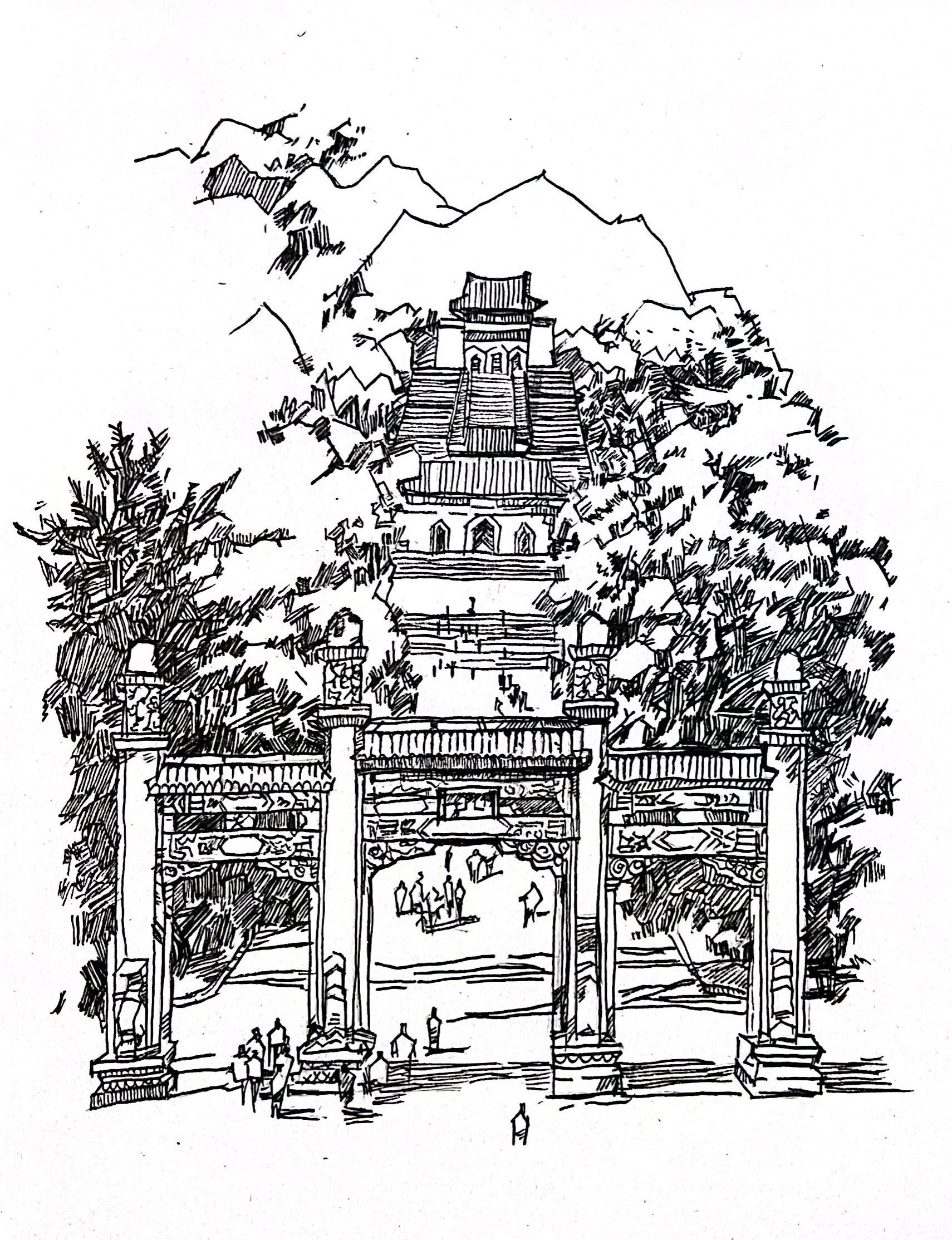 2022级建筑学专业学生余薇同学则通过速写作品《中山陵》展现了孙中山先生的陵墓建筑。通过简练的线条,恰到好处的留白与阴影,她将中山陵的庄严生动呈现。余薇表示:“中山陵作为‘中华民族的丰碑’,见证了中国现代史上的重要历程,也承载着人们对民主、自由、独立的坚定追求。希望所有人都能珍惜中华民族的发展历程,通过这些建筑载体,永远记住伟人的卓越贡献,记住党和国家强盛的来之不易。”