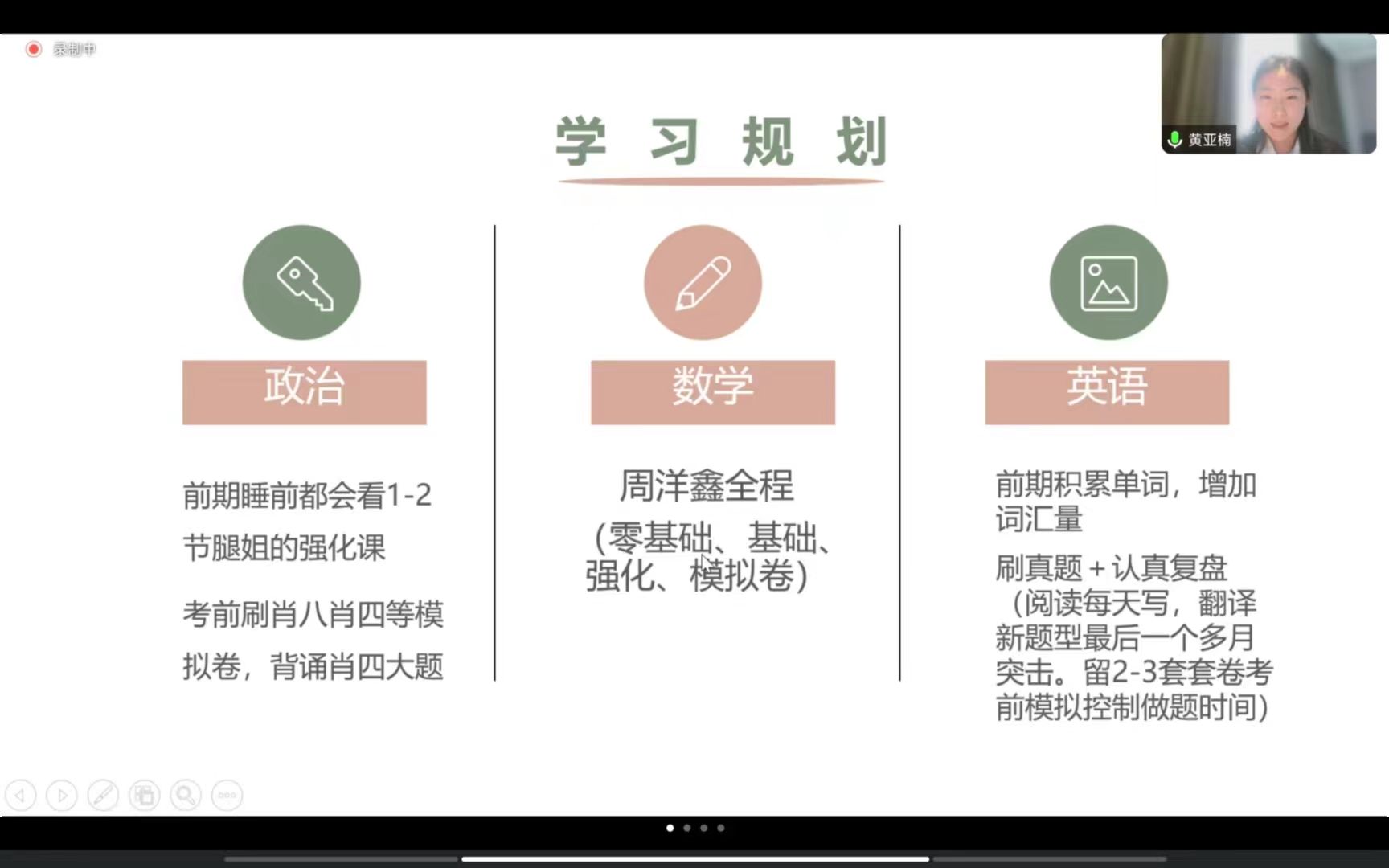 学姐黄亚楠,2023年毕业,南京工业大学土木水利专硕在读,她围绕如何选取专业和院校、制定复习计划、调整心态以及复试中的注意事项等方面谈了自己的亲生经历和备考感受,为参会的同学们提供了许多有用的信息与宝贵的经验。