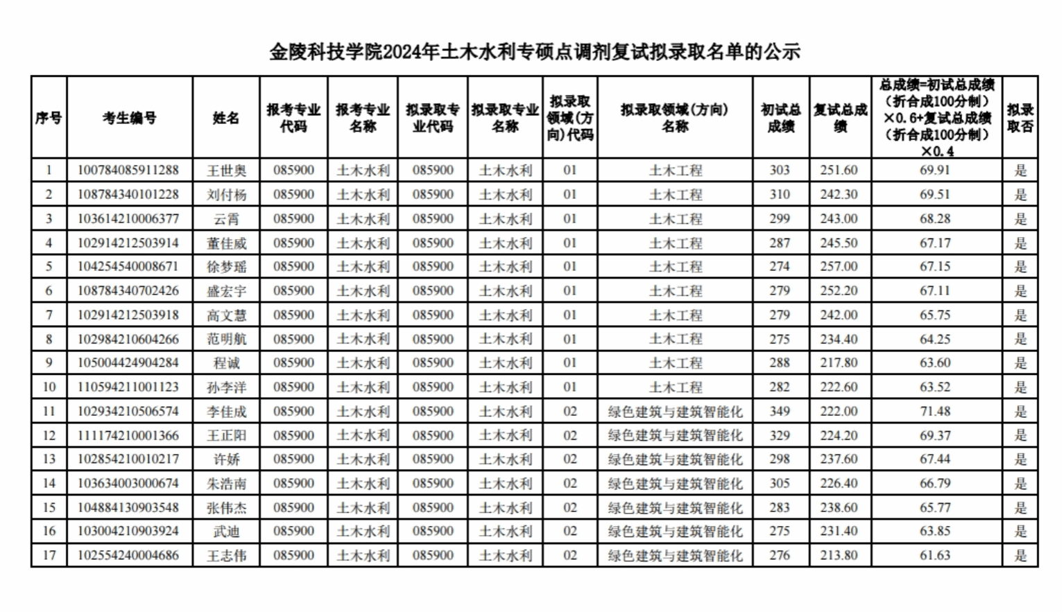 附:太阳集团tcy87222024年土木水利专硕点调剂复试拟录取名单的公示